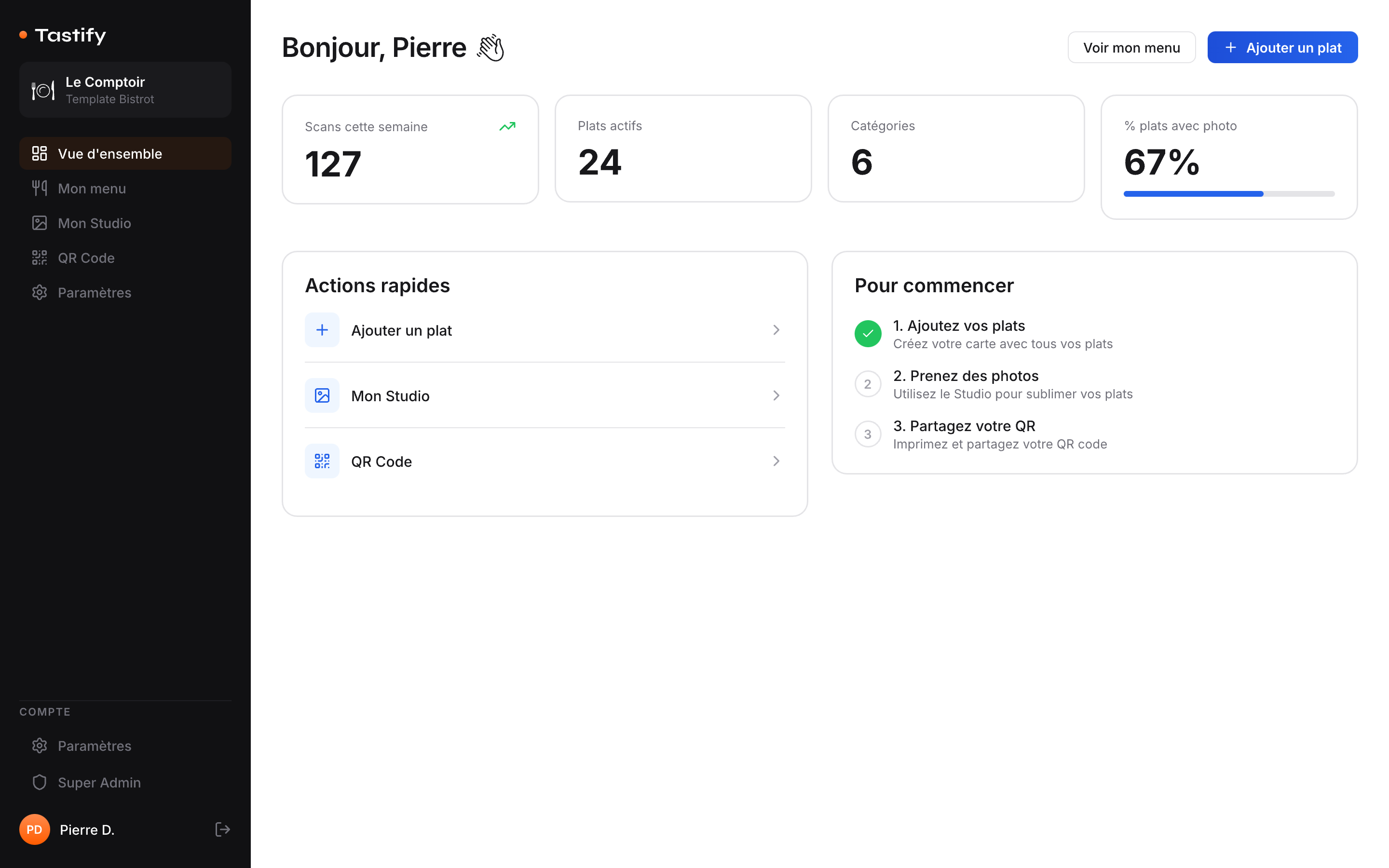 Ajoutez vos plats, retouchez vos photos avec l'IA, générez votre QR code et suivez vos statistiques de consultation — tout depuis un seul endroit.